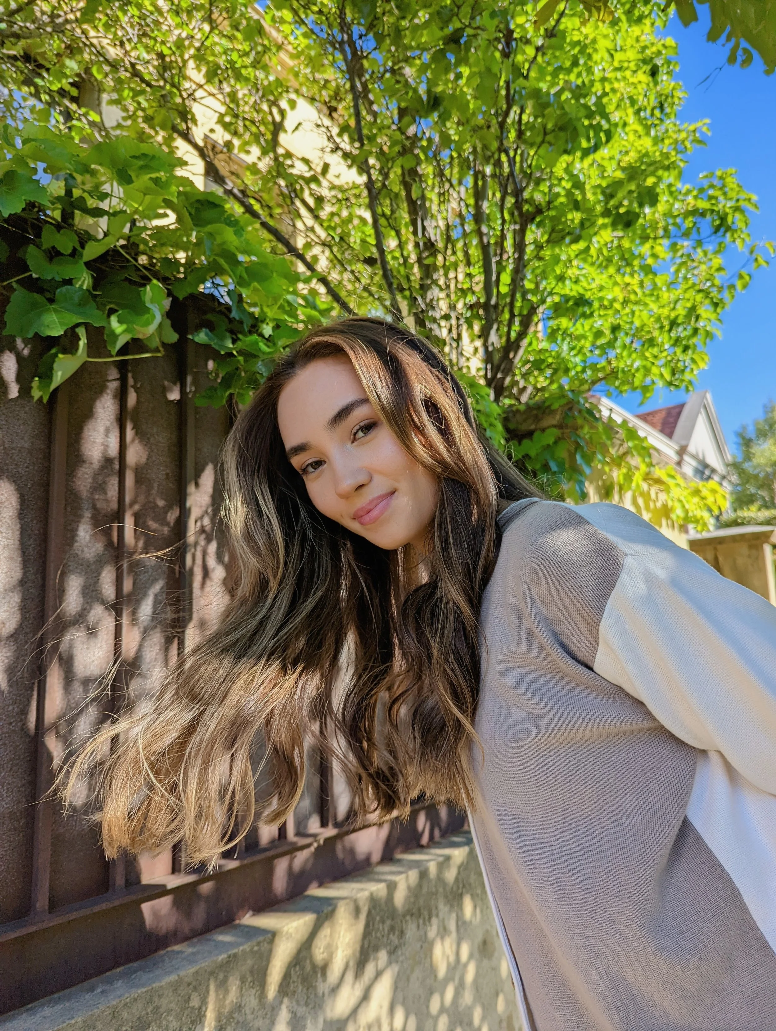 I love to shoot in places where there’s a mix of sun and shadow in the same spot. Shadows can play a big role in contouring the face, softening the lighting and also providing interesting shapes to work with in your photo. Below is an example of how shadows can be used on the wall to make interesting patterns and shapes with the leaves, and also spotted lighting on her hair and face for more artistic effect! Gotta love shadows.
